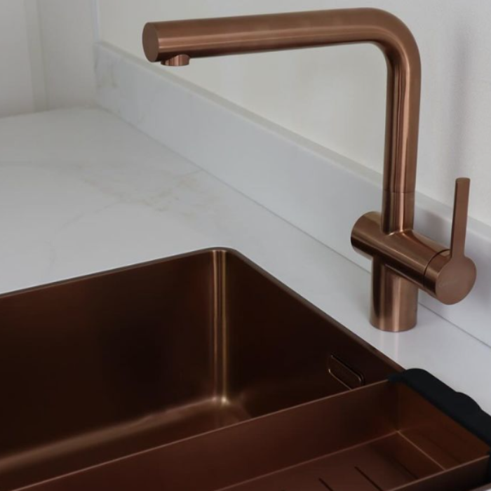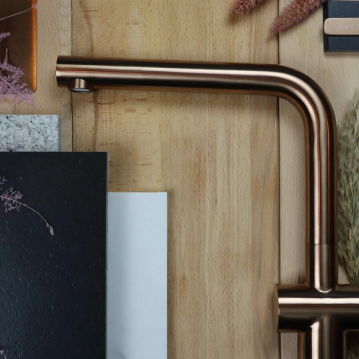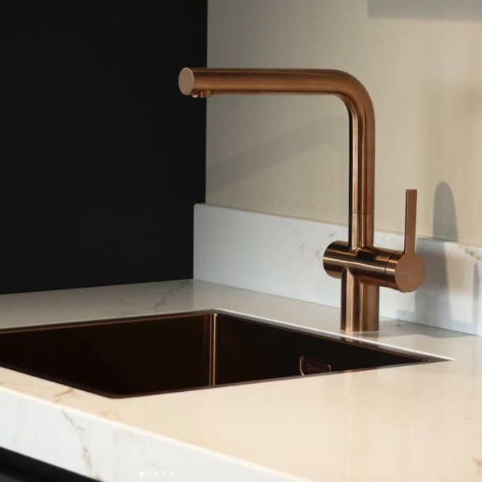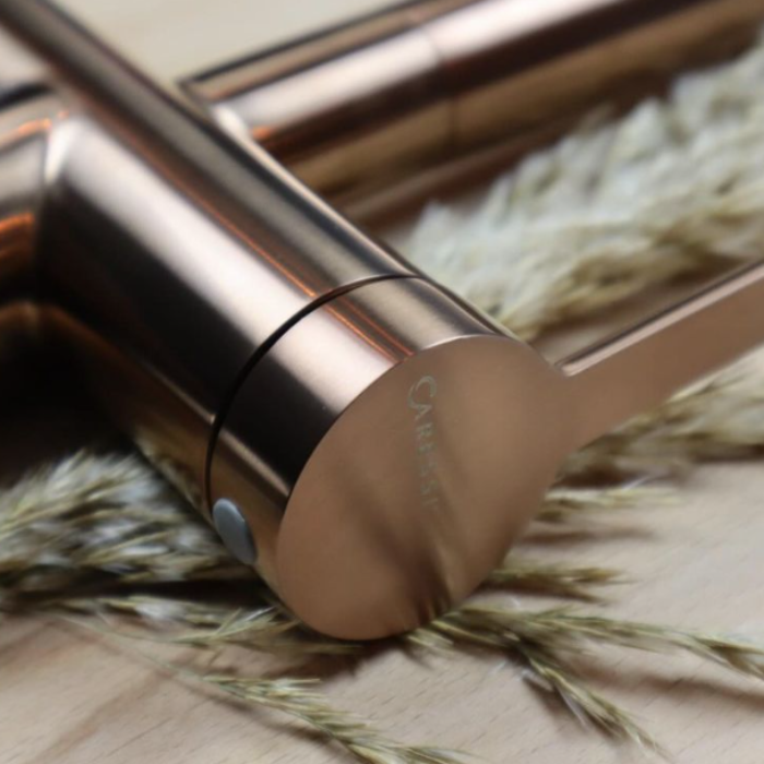 Caressi Copper Line -keittiöhanassa CA1108CO ECO yhdistyvät moderni muotoilu, kestävyys ja käytännöllisyys. Sen tyylikäs kuparinen viimeistely ja toiminnalliset ominaisuudet tekevät siitä täydellisen valinnan kodinomistajille, jotka etsivät tyyliä ja tehokkuutta keittiöönsä.