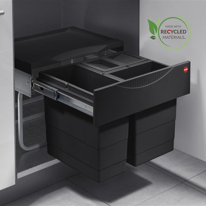 HAILO AS Raumspar Tandem S 12/8/8/D Black è un sistema di raccolta differenziata sostenibile e compatto, progettato per armadi con ante a battente da 500 mm di larghezza. Con tre contenitori rimovibili, un sistema di scorrimento a estrazione totale e una pratica area di stoccaggio integrata nel coperchio, questo modello offre efficienza e un uso intelligente dello spazio, il tutto realizzato con plastica riciclata.